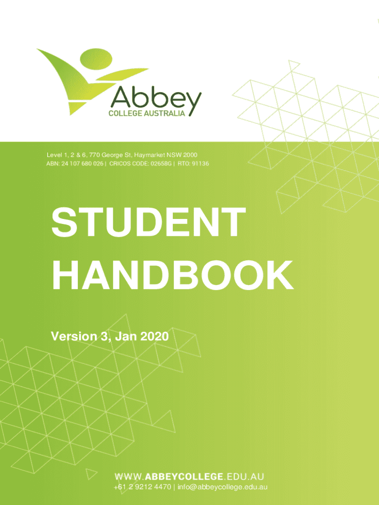 Level 1, 2 & 6, 770 George St, Haymarket NSW 2000STUDENT HANDBOOK Version 3, Jan 2020Version 3.0, Jan 2020+61 2 9212 4470 | info@abbeycollege.edu.au0ABOUT THIS STUDENT HANDBOOK All Abbey College Australia