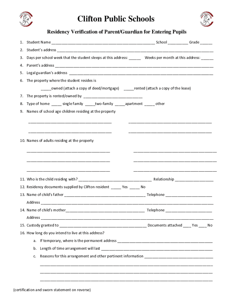 Clifton Public Schools Residency Verification of Parent/Guardian for Entering Pupils 1. Student Name ___ School ___ Grade ___ 2. Students address ___ 3. Days per school week that the student sleeps