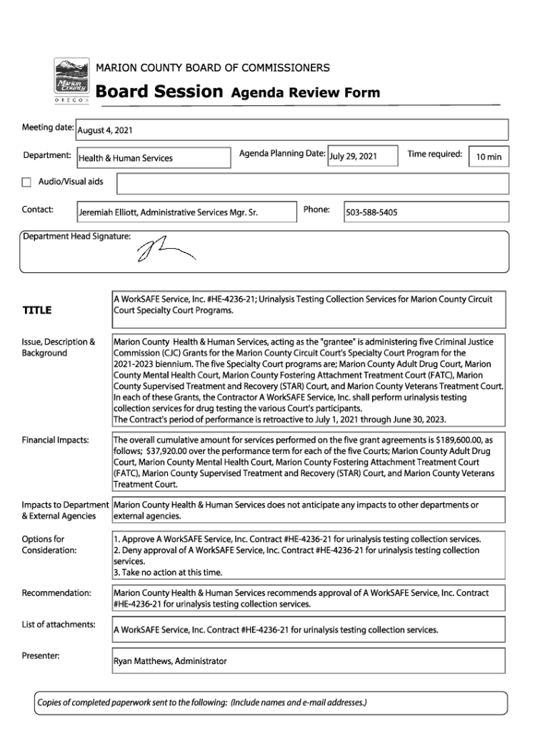 Person Sending: Linda WilsonDepartment: Health & Human ServicesContact Phone #: 5033612792Date Sent:ContractAmendment #LeaseIGAMOUGrant (attach approved