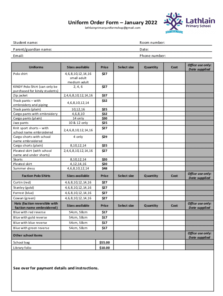 Uniform Order Form January 2022 lathlainprimaryuniformshop@gmail.comStudent name:Room number:Parent/guardian name:Date:Email:Phone number: Uniforms Polo shirking Polo Shirt (can only be purchased