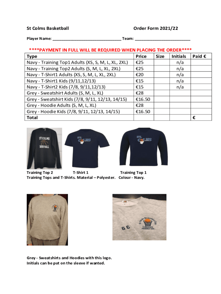 St Calms BasketballOrder Form 2021/22Player Name: ___ Team: ___****PAYMENT IN FULL WILL BE REQUIRED WHEN PLACING THE ORDER**** Type Price Size Initials Paid Navy Training Top1 Adults (XS, S, M, L,