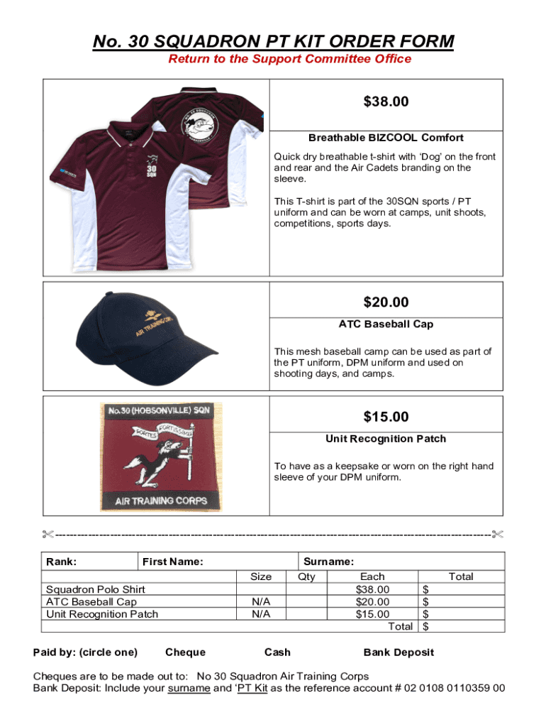 No. 30 SQUADRON PT KIT ORDER FORM Return to the Support Committee Office$38.00 Breathable COOL Comfort Quick dry breathable shirt with Dog on the front and rear and the Air Cadets branding on the