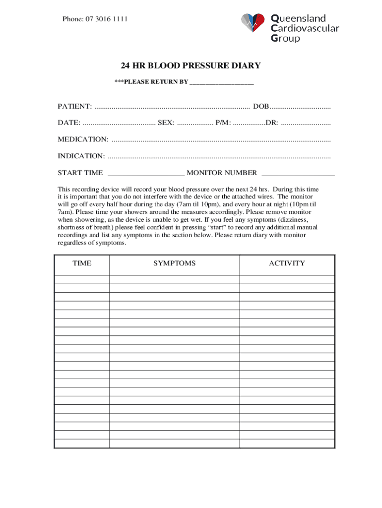 Phone: 07 3016 111124 HR BLOOD PRESSURE DIARY ***PLEASE RETURN BY ___PATIENT: ................................................................................. DOB................................