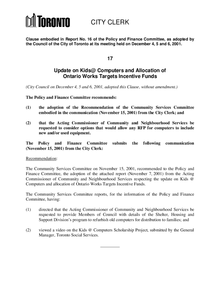 CITY CLERK Clause embodied in Report No. 16 of the Policy and Finance Committee, as adopted by the Council of the City of Toronto at its meeting held on December 4, 5 and 6, 2001.17 Update on Kids