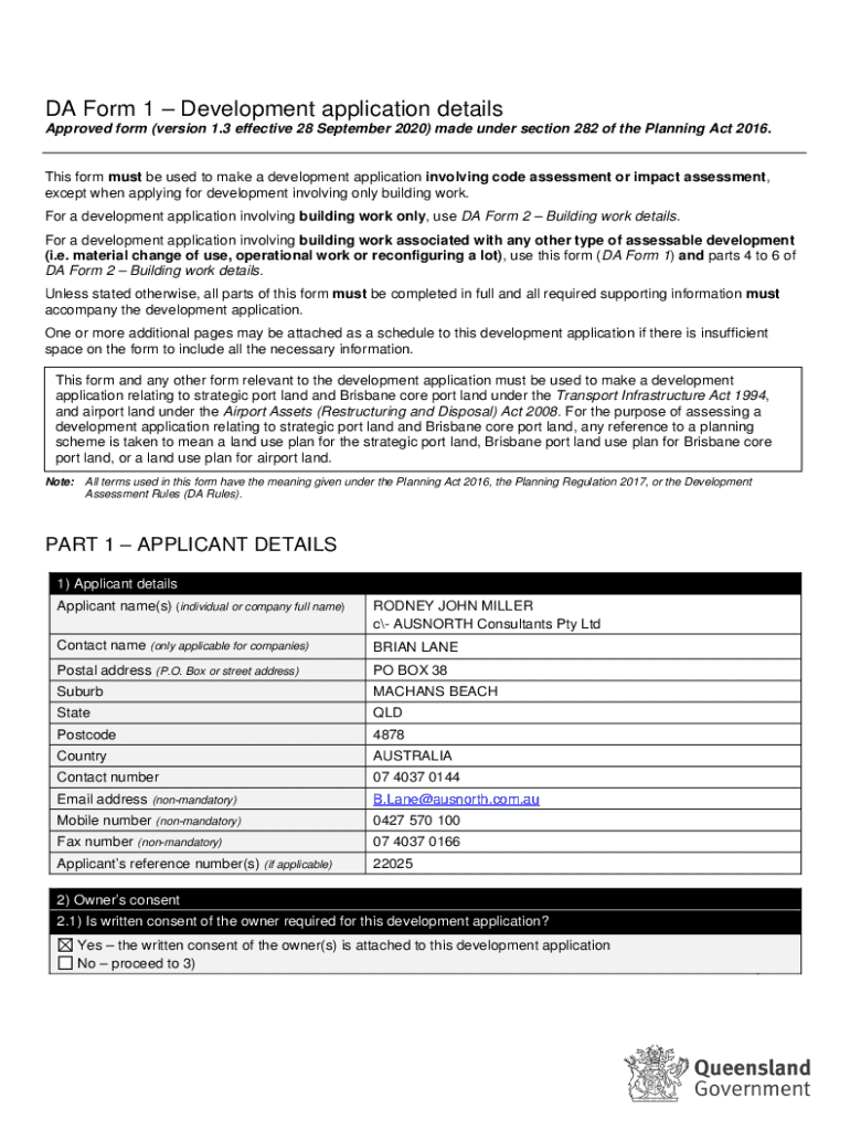 DA Form 1 Development application details Approved form (version 1.3 effective 28 September 2020) made under section 282 of the Planning Act 2016. This form must be used to make a development application