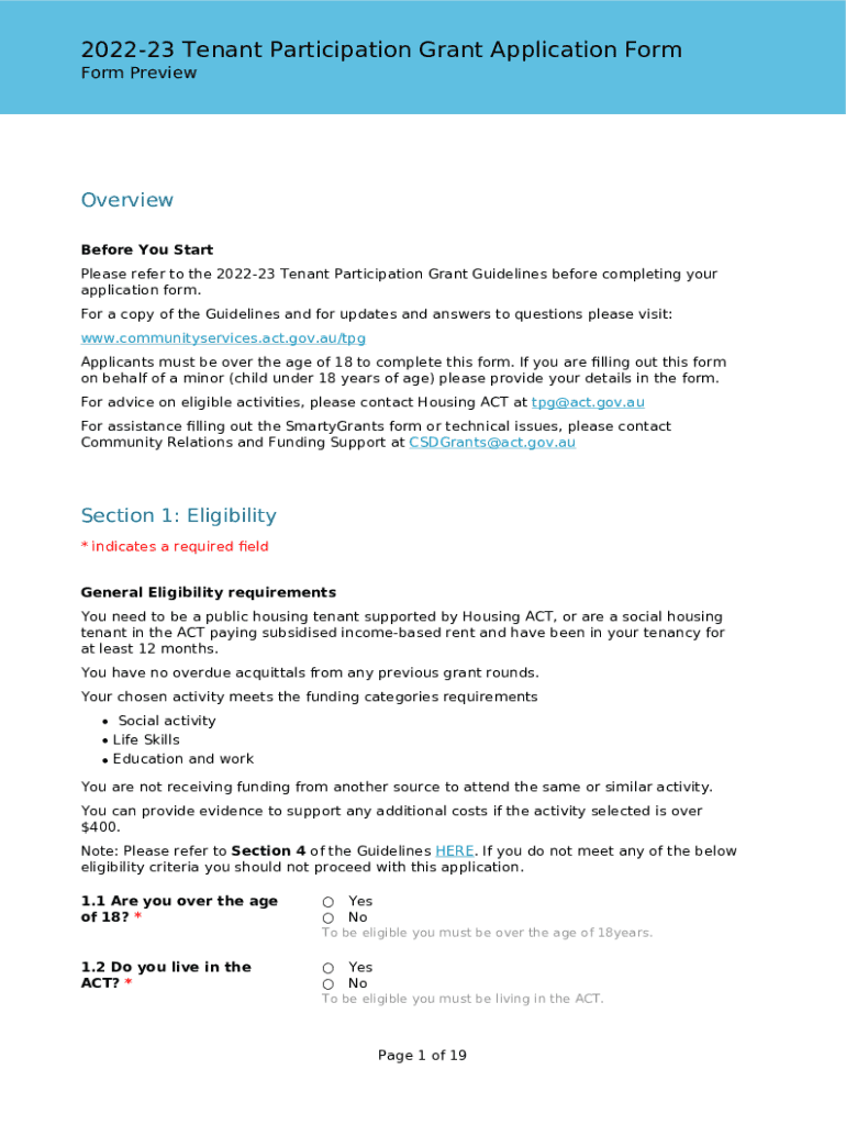 202223 Tenant Participation Grant Application Form PreviewOverview Before You Start Please refer to the 202223 Tenant Participation Grant Guidelines before completing your application form. For a