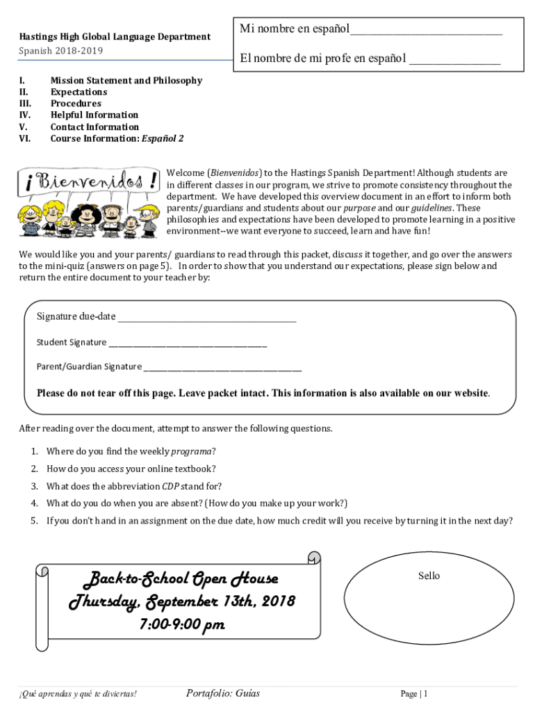 Hastings High Global Language Department Spanish 20182019 I. II. III. IV. V. VI. Min ombre en Español___ El hombre DE me prove en Español ___Mission Statement and Philosophy Expectations Procedures