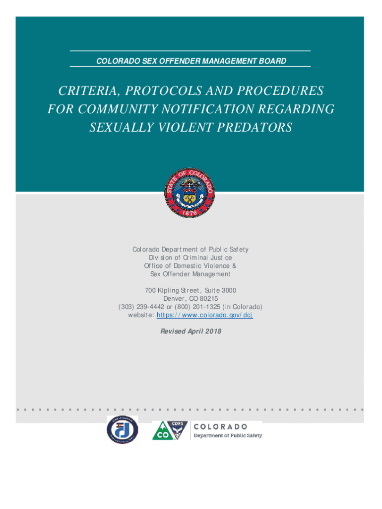 COLORADO SEX OFFENDER MANAGEMENT BOARDCRITERIA, PROTOCOLS AND PROCEDURES FOR COMMUNITY NOTIFICATION REGARDING SEXUALLY VIOLENT PREDATORS Colorado Department of Public Safety Division of Criminal Justice