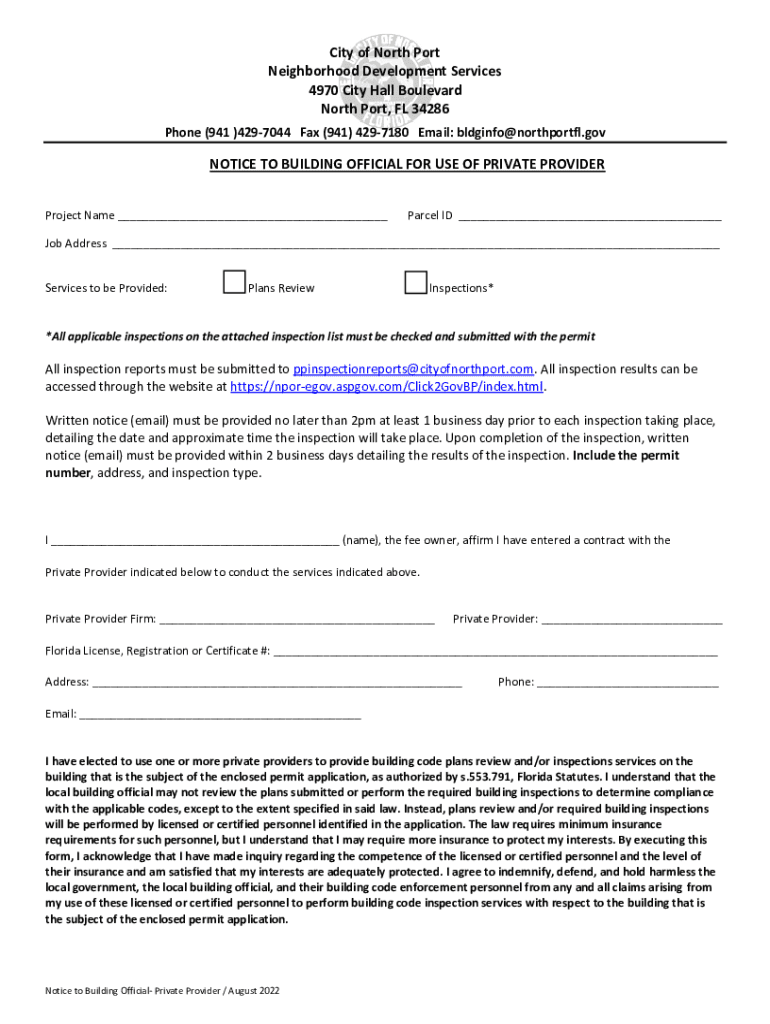 City of North Port Neighborhood Development Services 4970 City Hall Boulevard North Port, FL 34286 Phone (941)4297044 Fax (941) 4297180 Email: bldginfo@northportfl.govNOTICE TO BUILDING OFFICIAL FOR