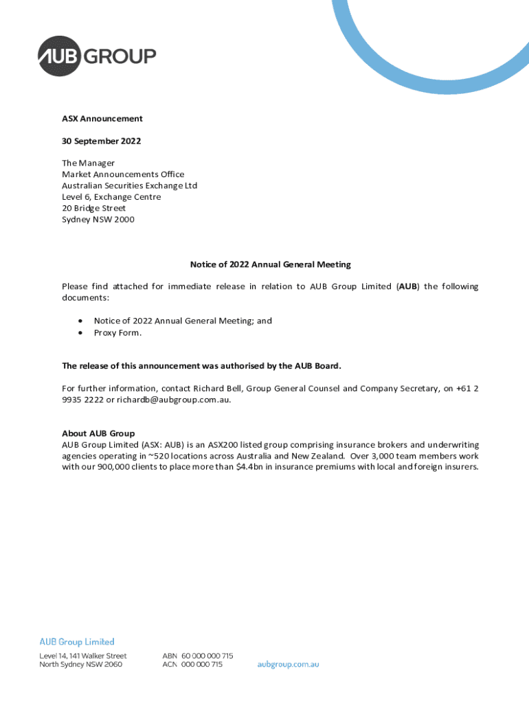 ASX Announcement 30 September 2023 The Manager Market Announcements Office Australian Securities Exchange Ltd Level 6, Exchange Center 20 Bridge Street Sydney NSW 2000Notice of 2022 Annual General