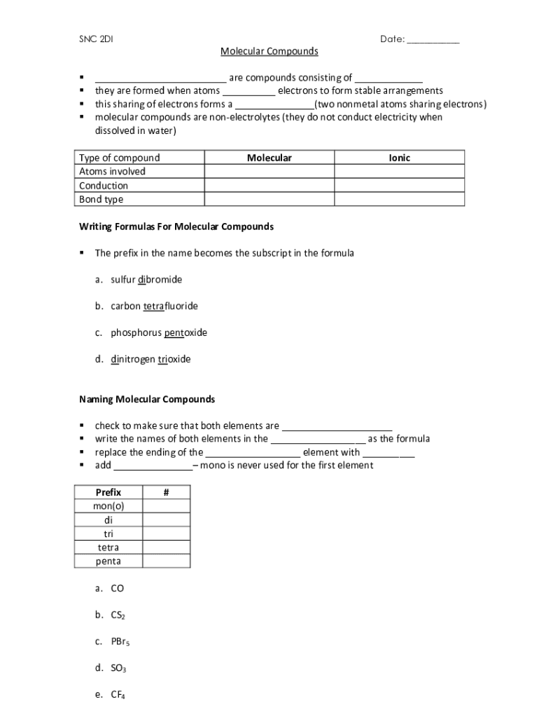 SNC 2DIDate: ___Molecular Compounds ___ are compounds consisting of ___ they are formed when atoms ___ electrons to form stable arrangements this sharing of electrons forms a ___(two nonmetal atoms