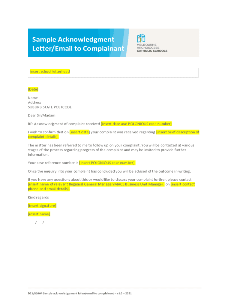 Sample Acknowledgment Letter/Email to Complainant Insert school letterhead[Date] Name Address SUBURB STATE POSTCODE Dear Sir/Madam RE: Acknowledgment of complaint received [insert date and POLONIUS