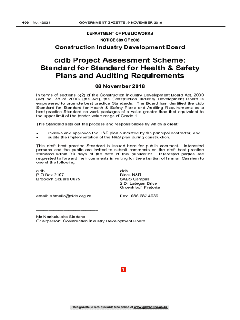 406 No. 42021GOVERNMENT GAZETTE, 9 NOVEMBER 2018DEPARTMENT OF PUBLIC WORKS NOTICE 689 OF 2018 689Construction Industry Development Board Act (38/2000): Standard for Health & Safety Plans and Auditing