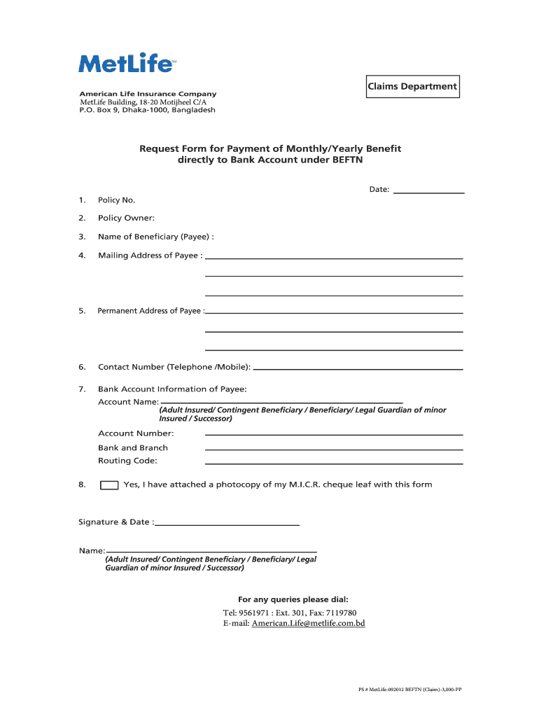 MetLife Building, 1820 Motijheel C/A Tel: 9561971 : Ext. 301, Fax: 7119780 Email: American. Life metlife.com.BD PS # MetLife092012 BEF TN (Claim)3,000PP Bangladesh Electronic Fund Transfer Network