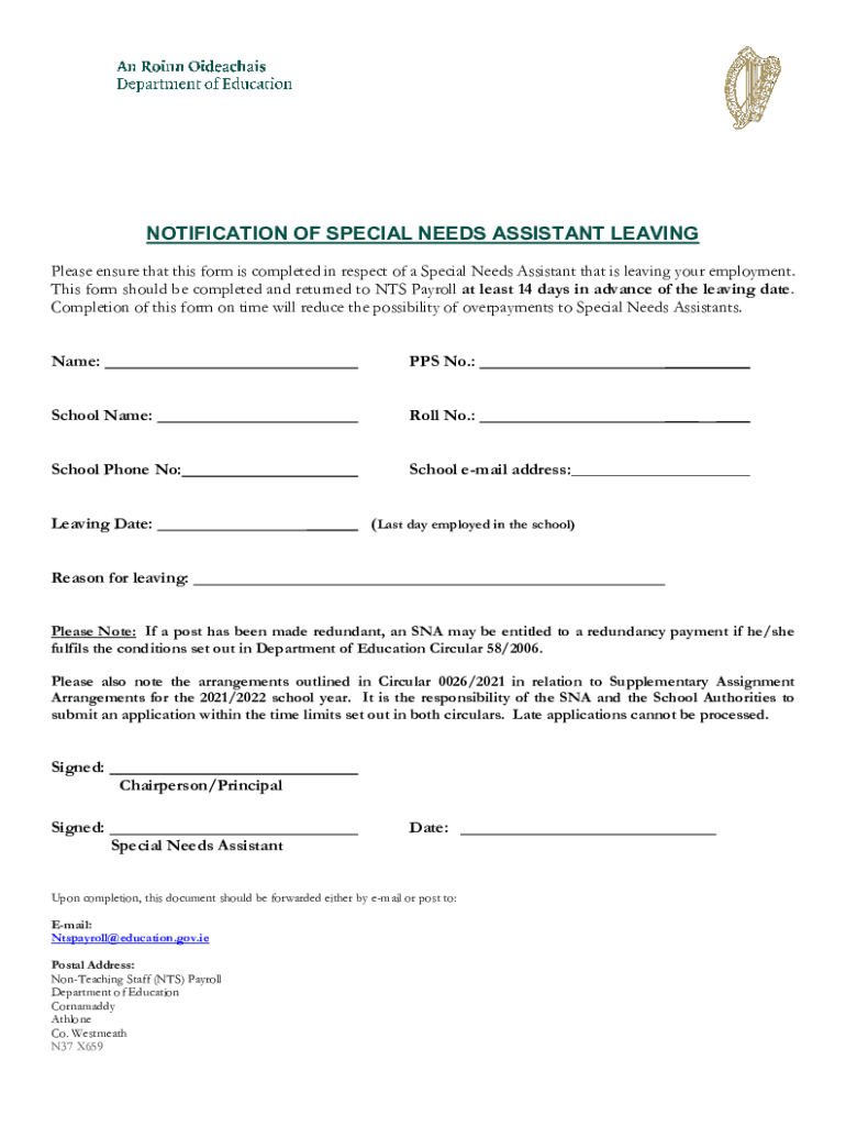 NOTIFICATION OF SPECIAL NEEDS ASSISTANT LEAVING Please ensure that this form is completed in respect of a Special Needs Assistant that is leaving your employment. This form should be completed and