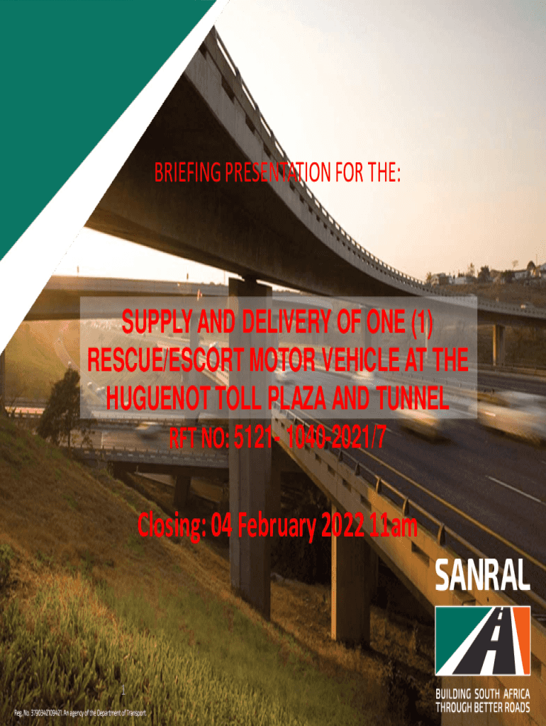 BRIEFING PRESENTATION FOR THE:SUPPLY AND DELIVERY OF ONE (1) RESCUE/ESCORT MOTOR VEHICLE AT THE HUGUENOT TOLL PLAZA AND TUNNEL FT NO: 5121 10402021/7Closing: 04 February 2023 11am1CONTENT1. 2. 3.