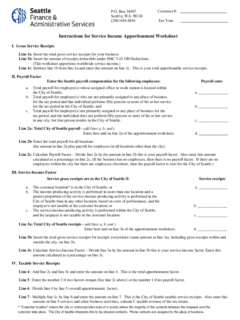 P.O. Box 34907 Seatt1e, WA 98124 (206) 6848484Customer #: ___ Tax Year:___Instructions for Service Income Apportionment Worksheet I. Gross Service Receipts Line 1a: Insert the total gross service