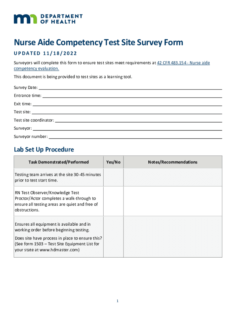 Nurse Aide Competency Test Site Survey Form UPDATED 11/18/2023 Surveyors will complete this form to ensure test sites meet requirements at 42 CFR 483.154 Nurse aide competency evaluation. This document