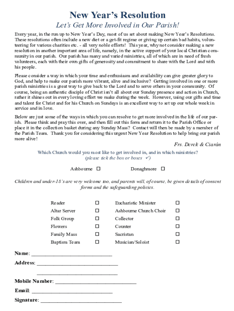 New Year's Resolution Lets Get More Involved in Our Parish! Every year, in the run-up to New Year's Day, most of us set about making New Year's Resolutions. These resolutions often include a new diet
