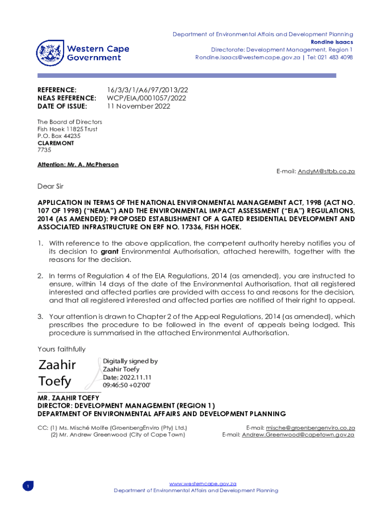 Department of Environmental Affairs and Development Planning Ron dine Isaacs Directorate: Development Management, Region 1 Rondine.Isaacs@westerncape.gov.za | Tel: 021 483 4098REFERENCE: NEAR REFERENCE: