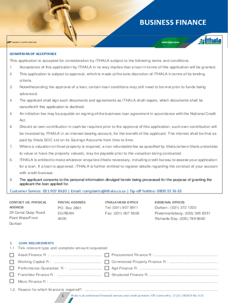 BUSINESS FINANCE DEVELOPMENT FINA NCE CORPORATION LIMITEDCONDITIONS OF ACCEPTANCE This application is accepted for consideration by ITHACA subject to the following terms and conditions. 1. Acceptance