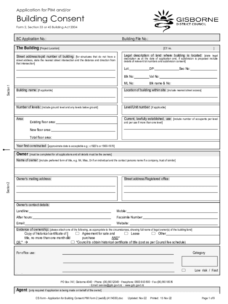 Application for PIM and/building Consent Form 2, Section 33 or 45 Building Act 2004BC Application No.:Building File No.:The Building [Project Location][CT no. Legal description of land where building