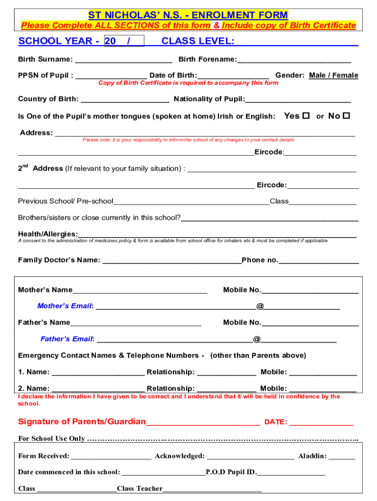 ST NICHOLAS N.S. Enrollment Formulas Complete ALL SECTIONS of this form & Include copy of Birth CertificateSCHOOL YEAR 20 _/CLASS LEVEL:___Birth Surname: ___ Birth Forename:___ PPLN of Pupil : ___