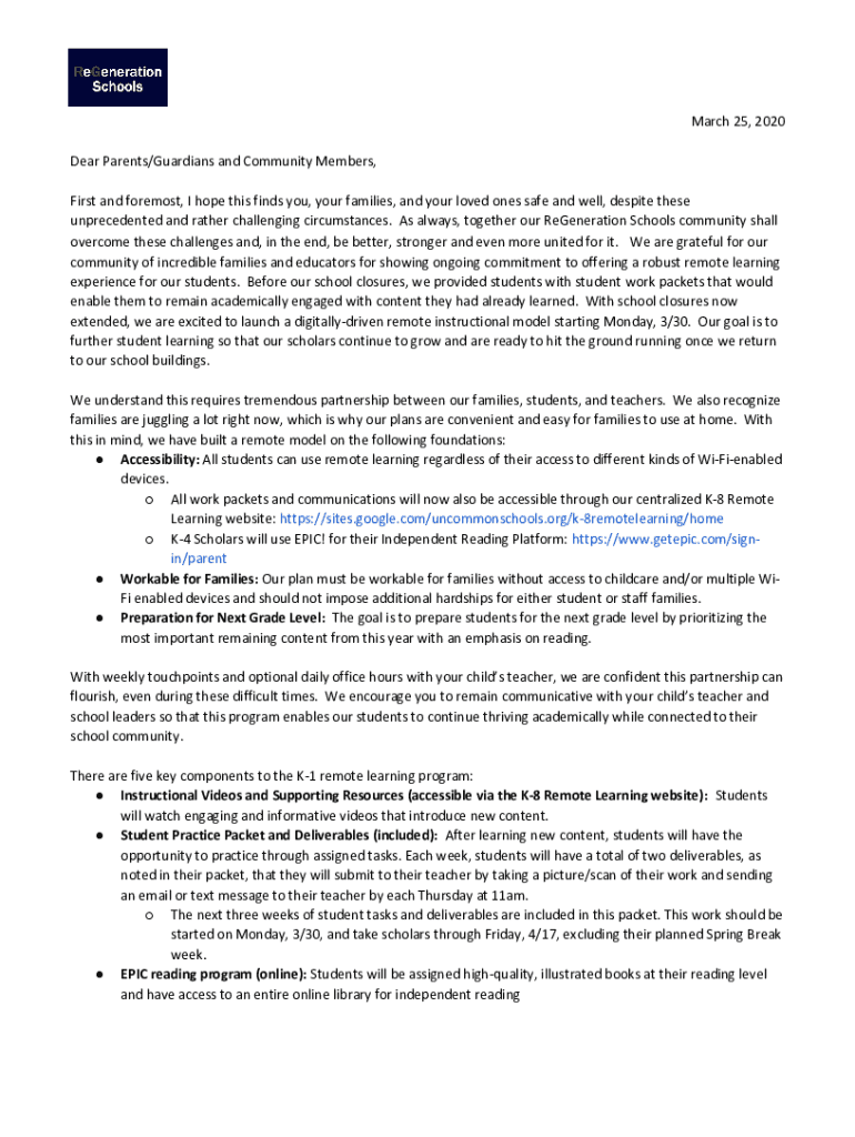 March 25, 2020, Dear Parents/Guardians and Community Members, First and foremost, I hope this finds you, your families, and your loved one's safe and well, despite these unprecedented and rather challenging