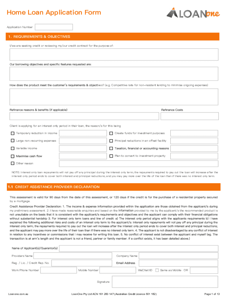 Home Loan Application Form Application Number1. REQUIREMENTS & OBJECTIVES I/we are seeking credit or reviewing my/our credit contract for the purpose of:VES? (e.g. Competitive rate for nonresident