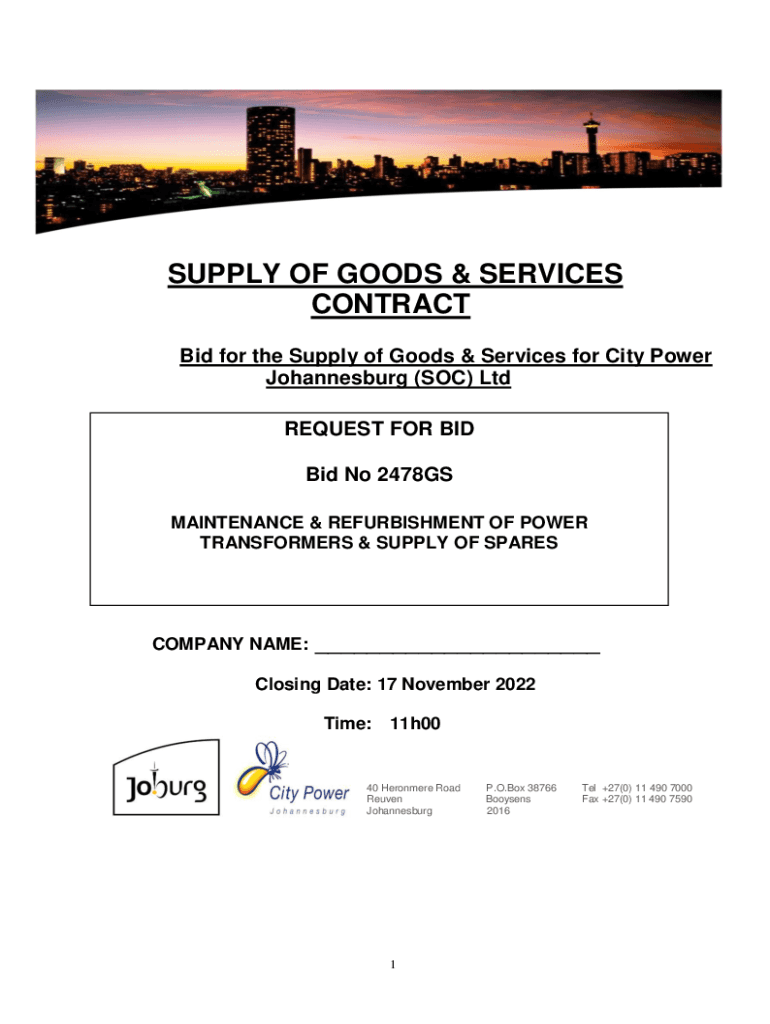 SUPPLY OF GOODS & SERVICES CONTRACT Bid for the Supply of Goods & Services for City Power Johannesburg (SOC) Ltd REQUEST FOR BID No 2478GS MAINTENANCE & REFURBISHMENT OF POWER TRANSFORMERS & SUPPLY