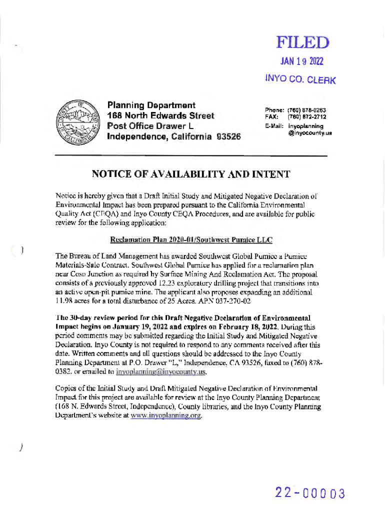 FILED JAN 19 2022 INTO CO. CLERKPlanning Department 168 North Edwards Street Post Office Drawer L Independence, California 93526Phone: (760) 8780263 FAX: (760) 8722712 Email: inyoplanning Inyo County.