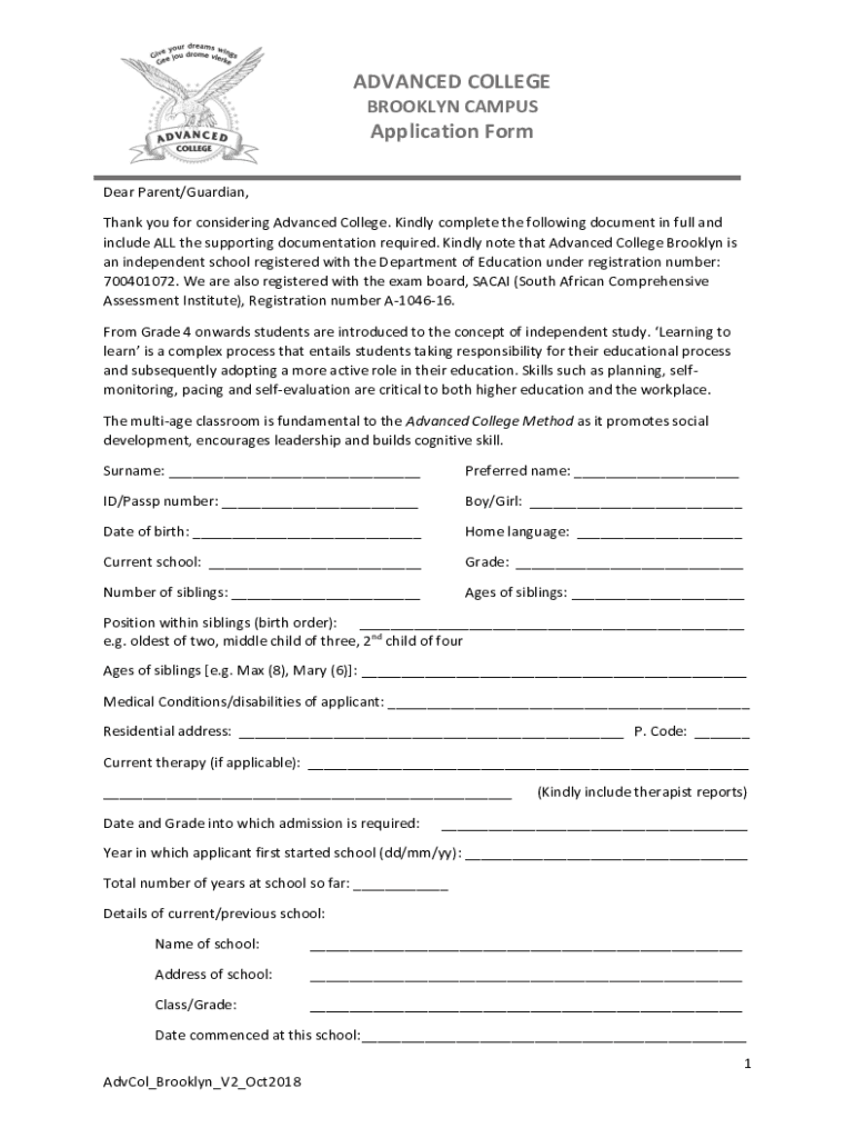 ADVANCED COLLEGE BROOKLYN CAMPUSApplication Form Dear Parent/Guardian, Thank you for considering Advanced College. Kindly complete the following document in full and include ALL the supporting documentation