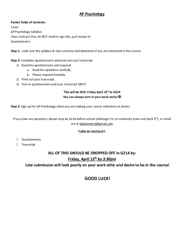 AP Psychology Packet Table of Contents: Cover AP Psychology Syllabus Class Contract (You do NOT need to sign this, just review it) Questionnaire Step 1: Look over the syllabus & class contract and