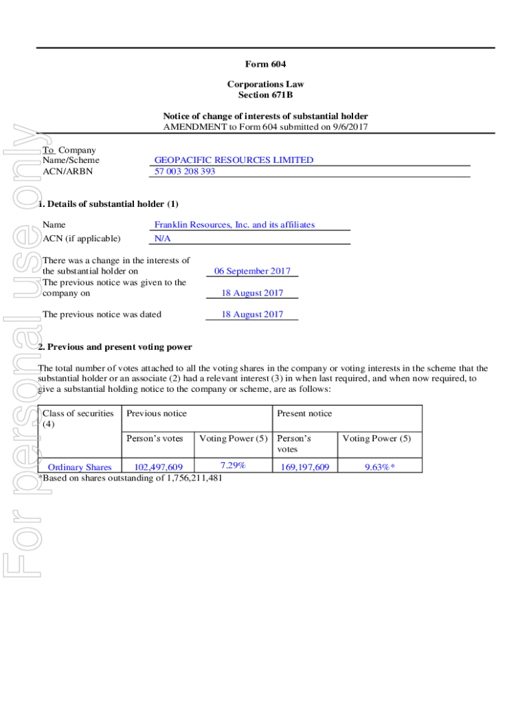 Form 604For personal use onlyCorporations Law Section 671BTo Company Name/Scheme ACN/ARBNNotice of change of interests of substantial holder AMENDMENT to Form 604 submitted on 9/6/2017GEOPACIFIC RESOURCES