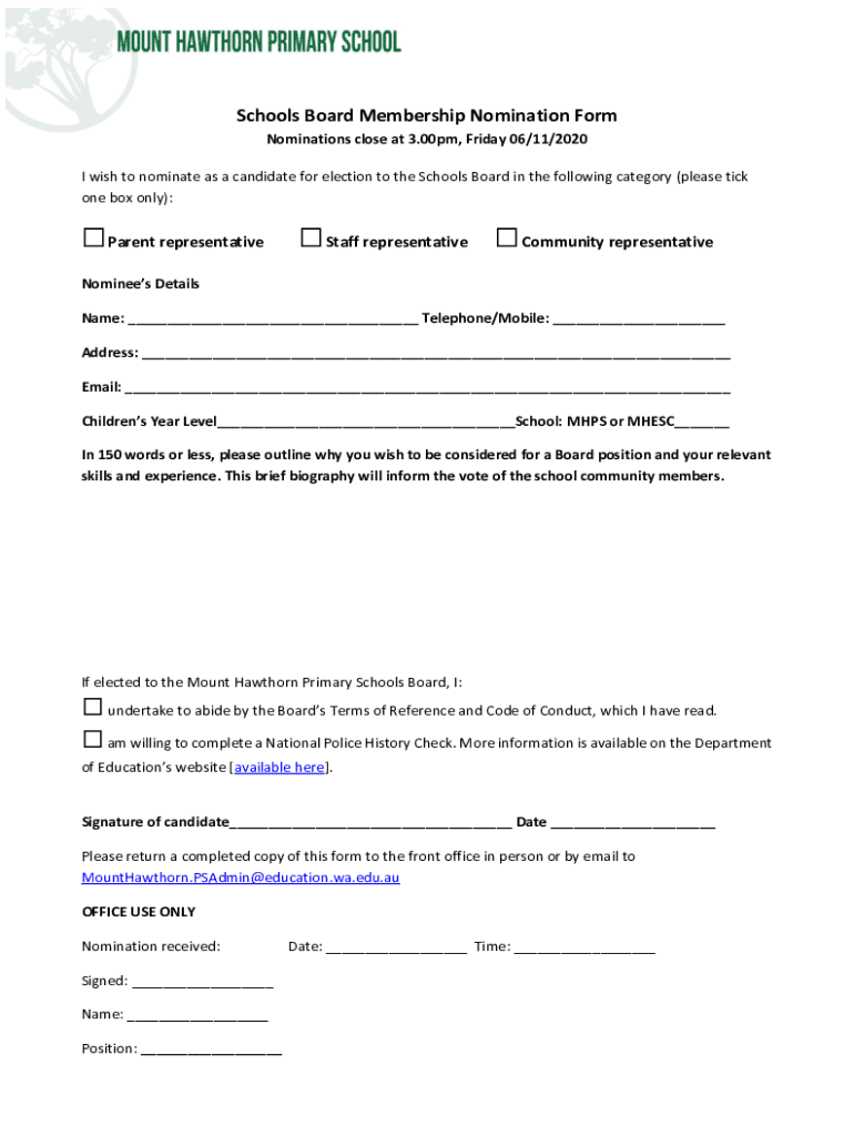 Schools Board Membership Nomination Form Nominations close at 3.00pm, Friday 06/11/2020 I wish to nominate as a candidate for election to the Schools Board in the following category (please tick one