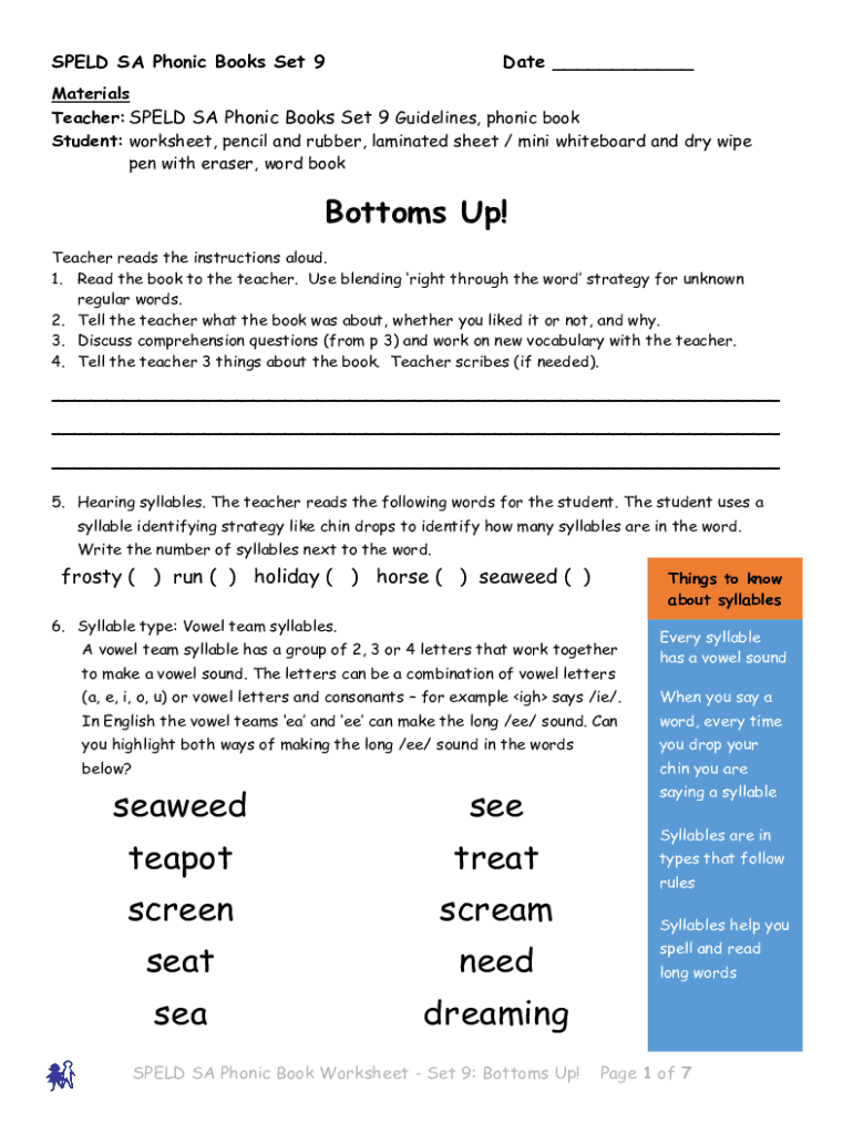 SPEED SA Phonic Books Set 9Date ___Materials Teacher: SPEED SA Phonic Books Set 9 Guidelines, phonic book Student: worksheet, pencil and rubber, laminated sheet / mini whiteboard and dry wipe pen