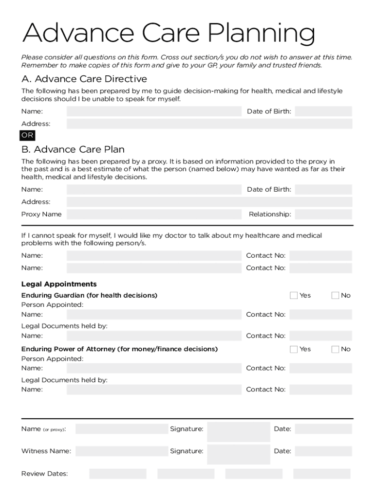 Advance Care Planning Please consider all questions on this form. Cross out section/s you do not wish to answer at this time. Remember to make copies of this form and give to your GP, your family