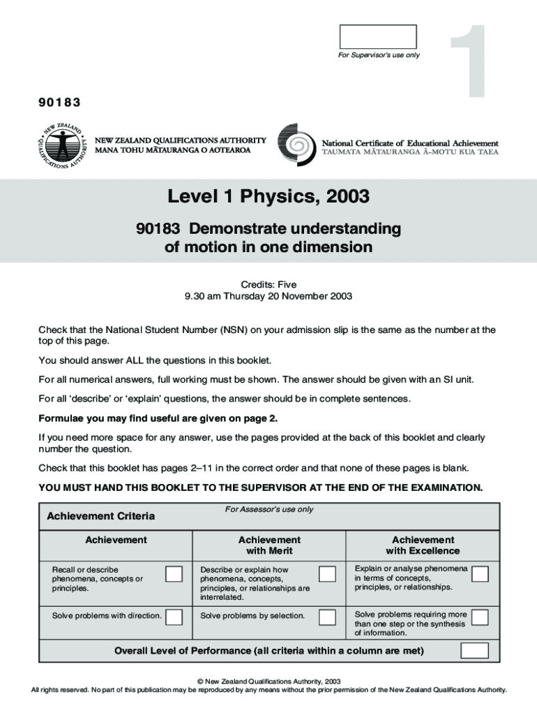 For Supervisors use only901831Level 1 Physics, 2003 90183 Demonstrate understanding of motion in one dimension Credits: Five 9.30 am Thursday 20 November 2003Check that the National Student Number