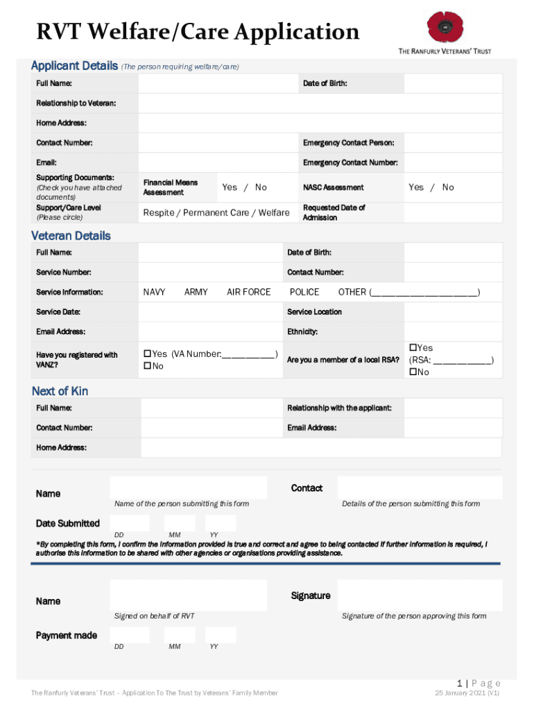 RVT Welfare/Care Application Applicant Details (The person requiring welfare/care) Full Name:Date of Birth:Relationship to Veteran: Home Address: Contact Number:Emergency Contact Person:Email:Emergency