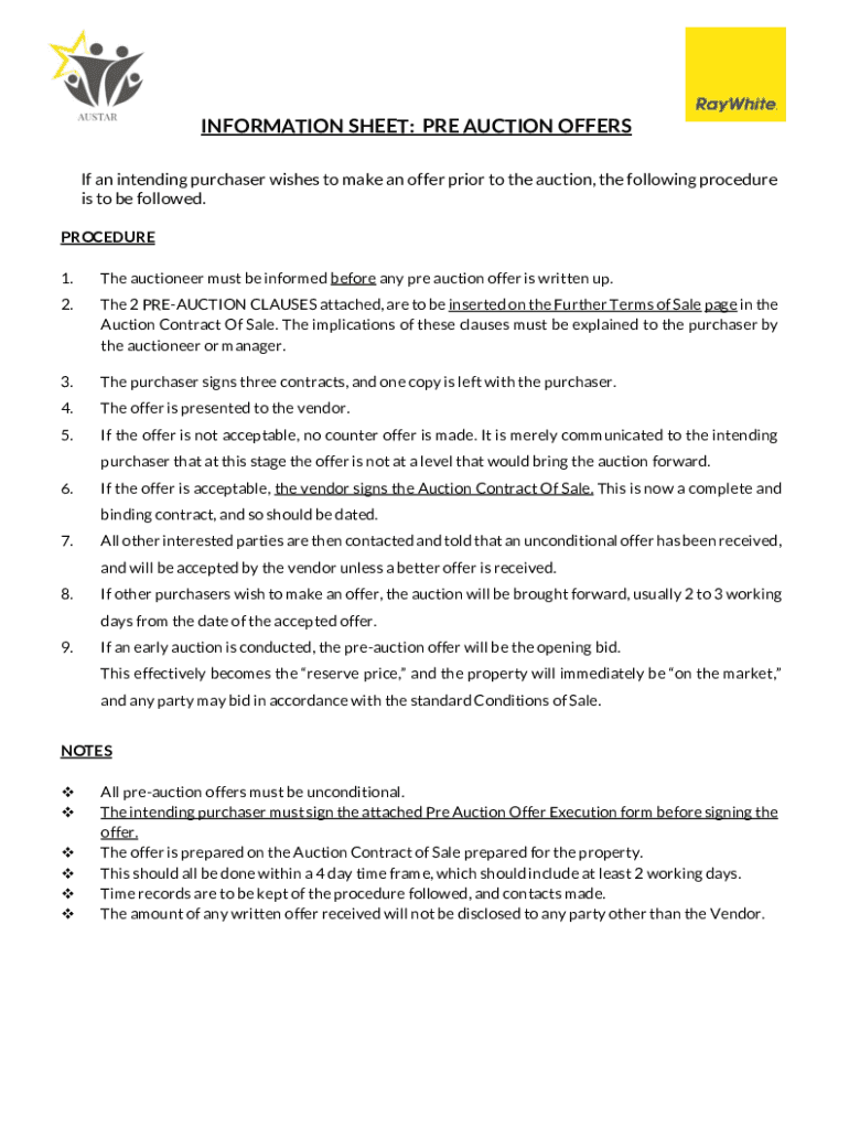INFORMATION SHEET: PRE AUCTION OFFERS If an intending purchaser wishes to make an offer prior to the auction, the following procedure is to be followed. PROCEDURE 1. The auctioneer must be informed