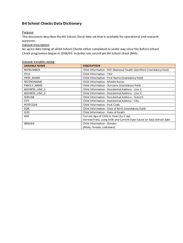 B4 School Checks Data Dictionary Purpose This document describes the B4 School Check data set that is available for operational and research purposes. Dataset Description: An update listing of all