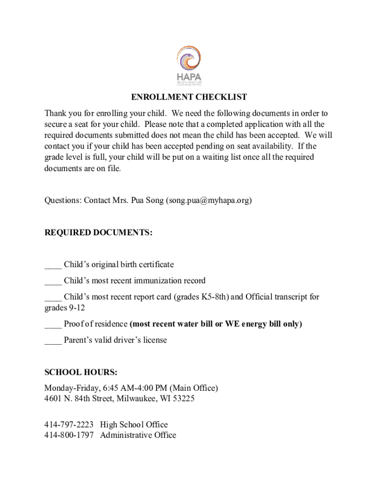 ENROLLMENT CHECKLIST Thank you for enrolling your child. We need the following documents in order to secure a seat for your child. Please note that a completed application with all the required documents