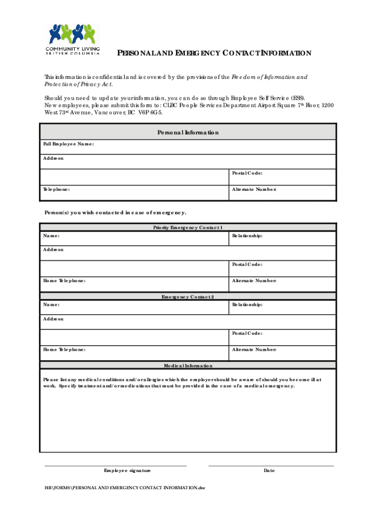 PERSONAL AND EMERGENCY CONTACT INFORMATION This information is confidential and is covered by the provisions of the Freedom of Information and Protection of Privacy Act. Should you need to update