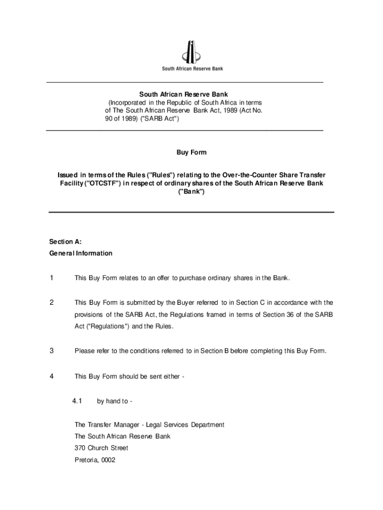 South African Reserve Bank (Incorporated in the Republic of South Africa in terms of The South African Reserve Bank Act, 1989 (Act No. 90 of 1989) (\” SARA Act\”)Buy Form Issued in terms of the