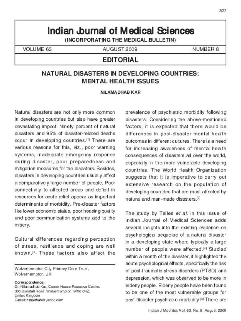 327Indian Journal of Medical Sciences (INCORPORATING THE MEDICAL BULLETIN)VOLUME 63AUGUST 2009NUMBER 8EDITORIAL NATURAL DISASTERS IN DEVELOPING COUNTRIES: MENTAL HEALTH ISSUES NILAMADHAB Natural disasters
