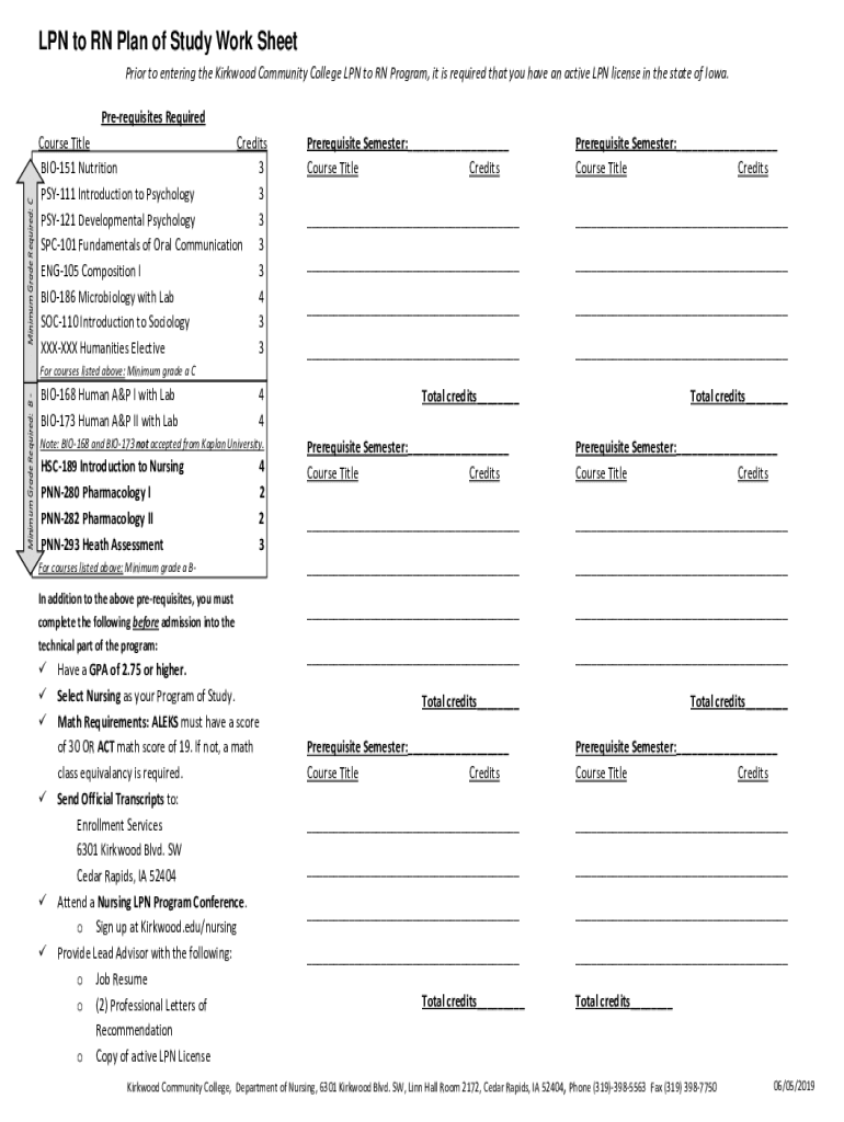 LPN to RN Plan of Study Work Sheet Prior to entering the Kirkwood Community College LPN to RN Program, it is required that you have an active LPN license in the state of Iowa. Minimum Grade Required: