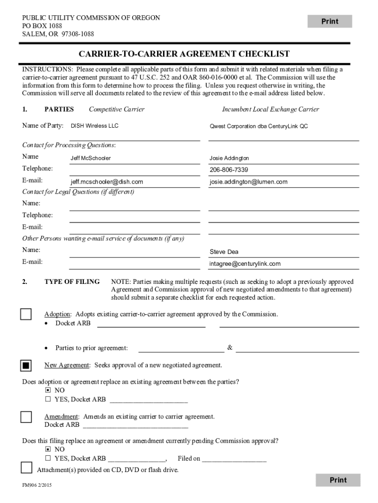 PUBLIC UTILITY COMMISSION OF OREGON PO BOX 1088 SALEM, OR 973081088PrintCARRIERTOCARRIER AGREEMENT CHECKLIST INSTRUCTIONS: Please complete all applicable parts of this form and submit it with related