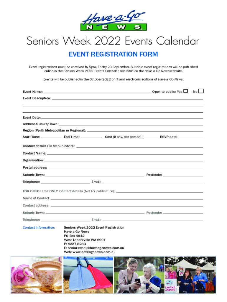 Seniors Week 2022 Events Calendar EVENT REGISTRATION FORM Event registrations must be received by 5pm, Friday 23 September. Suitable event registrations will be published online in the Seniors Week
