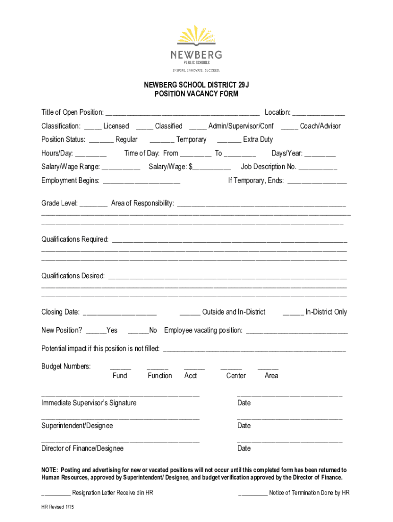 NEWER SCHOOL DISTRICT 29J POSITION VACANCY FORM Title of Open Position: ___ Location: ___ Classification: ___ Licensed ___ Classified ___ Admin/Supervisor/Cone ___ Coach/Advisor Position Status: ___
