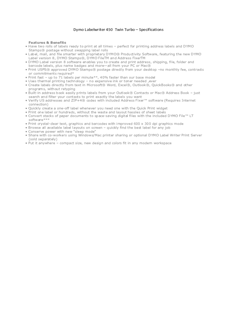 pdfFiller has made filling out and eSigning dymo label writer 450 easy. The solution is equipped with a set of features that enable you to edit and rearrange PDF content, add fillable fields, and eSign the document. Start a free trial to explore all the capabilities of pdfFiller, the ultimate document editing solution.